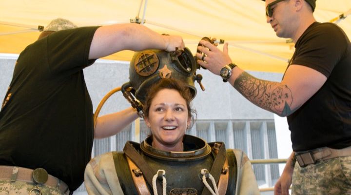 Navy Diver 2nd Class Valerie De Freitas is suited up during a Mark V Familiarization dive at the Naval Diving and Salvage Training Center to commentate the Year of the Military Diver.