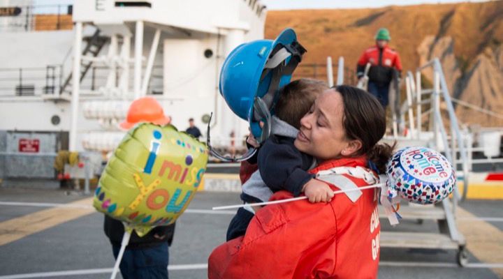 Chief Warrant Officer Heather Bove embraces her young son upon her return to Kodiak, Alaska. She had been on patrol on Coast Guard Cutter Alex Haley.