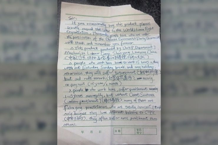 The message upon the paper was hand-written in blue ink. It was broken English, misspelled at times but neatly written. It said: “Sir, If you occasionally buy this product, please kindly send this letter to the World Human Right Organization. Thousands people here who are under the persecution of the Chinese Communist Party Government will thank and remember you forever.”
